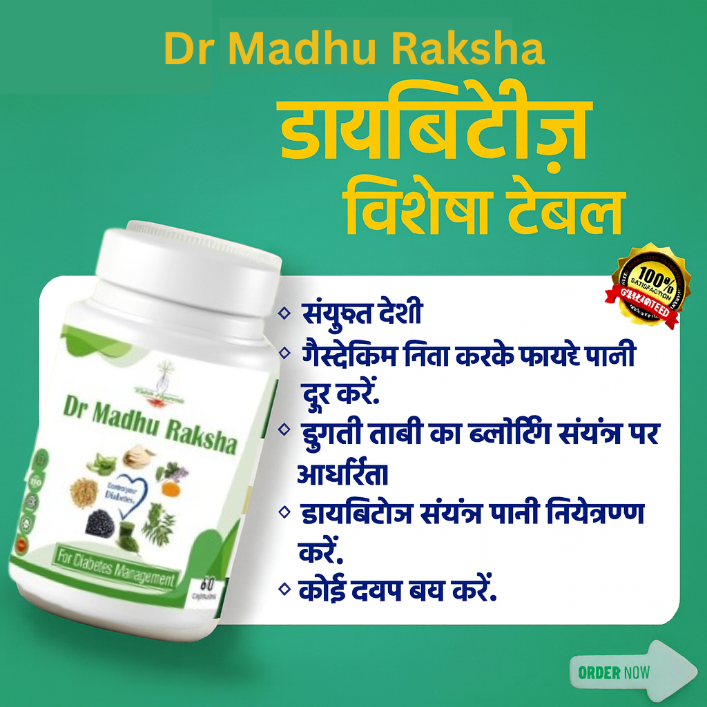 Dr Madhu Raksha 10 सालों से देश की सेवा कर रहा है, हेल्थ सेक्टर में अच्छा योगदान दिया है, भारत सरकार ने भी Dr Madhu Raksha को बार-बार सम्मानित किया है, Dr Madhu Raksha के डॉक्टरों ने यूनानी फार्मूला बनाया है। कई सालों की रिसर्च के बाद, असली और शुद्ध जड़ी-बूटियों का इस्तेमाल करके शुगर कंट्रोल पूर्ण डायबिटीज केयर पाउडर बनाया गया है। लाखों लोगों ने इस यूनानी फार्मूला दवा से डायबिटीज को कंट्रोल किया है और कर रहे हैं।